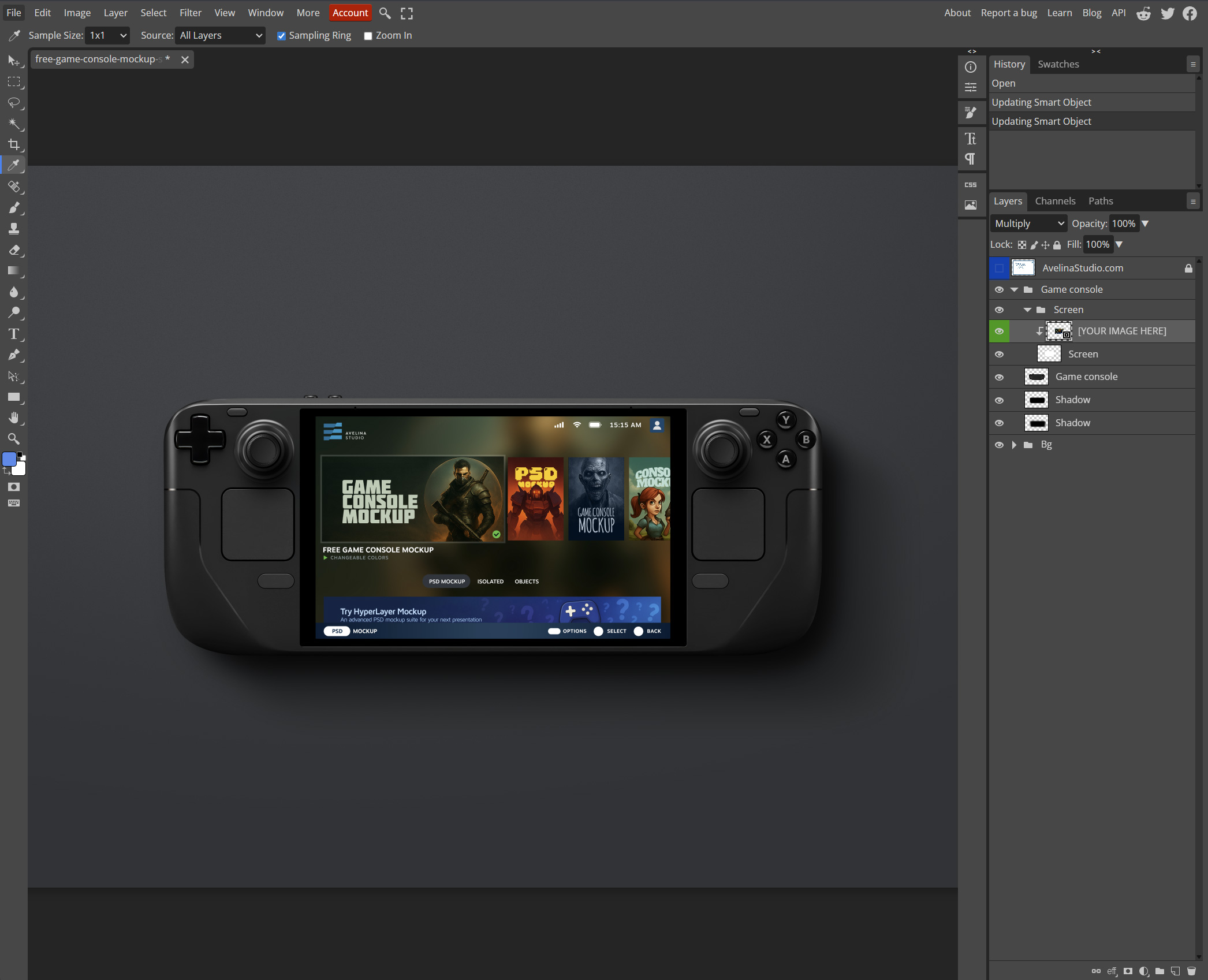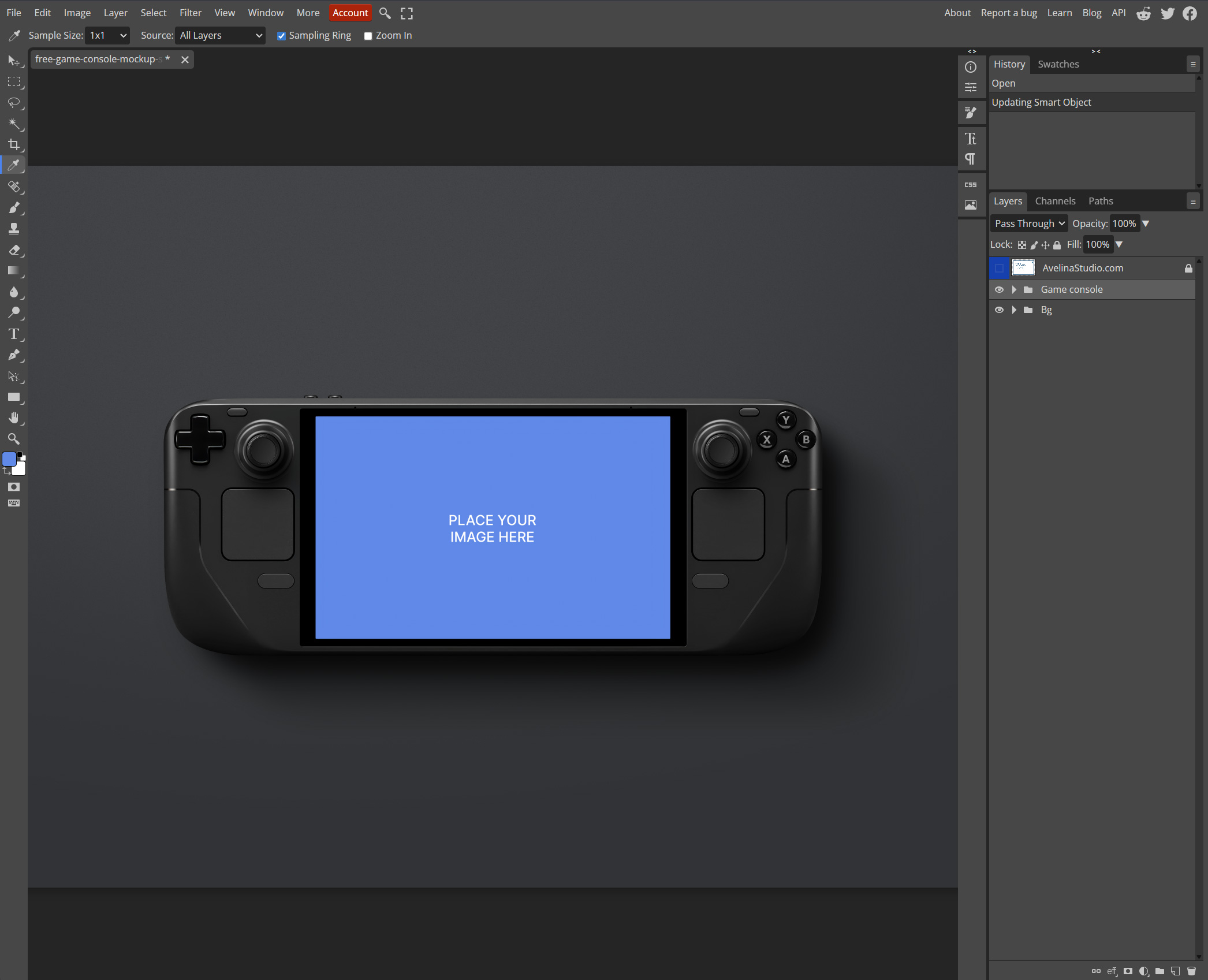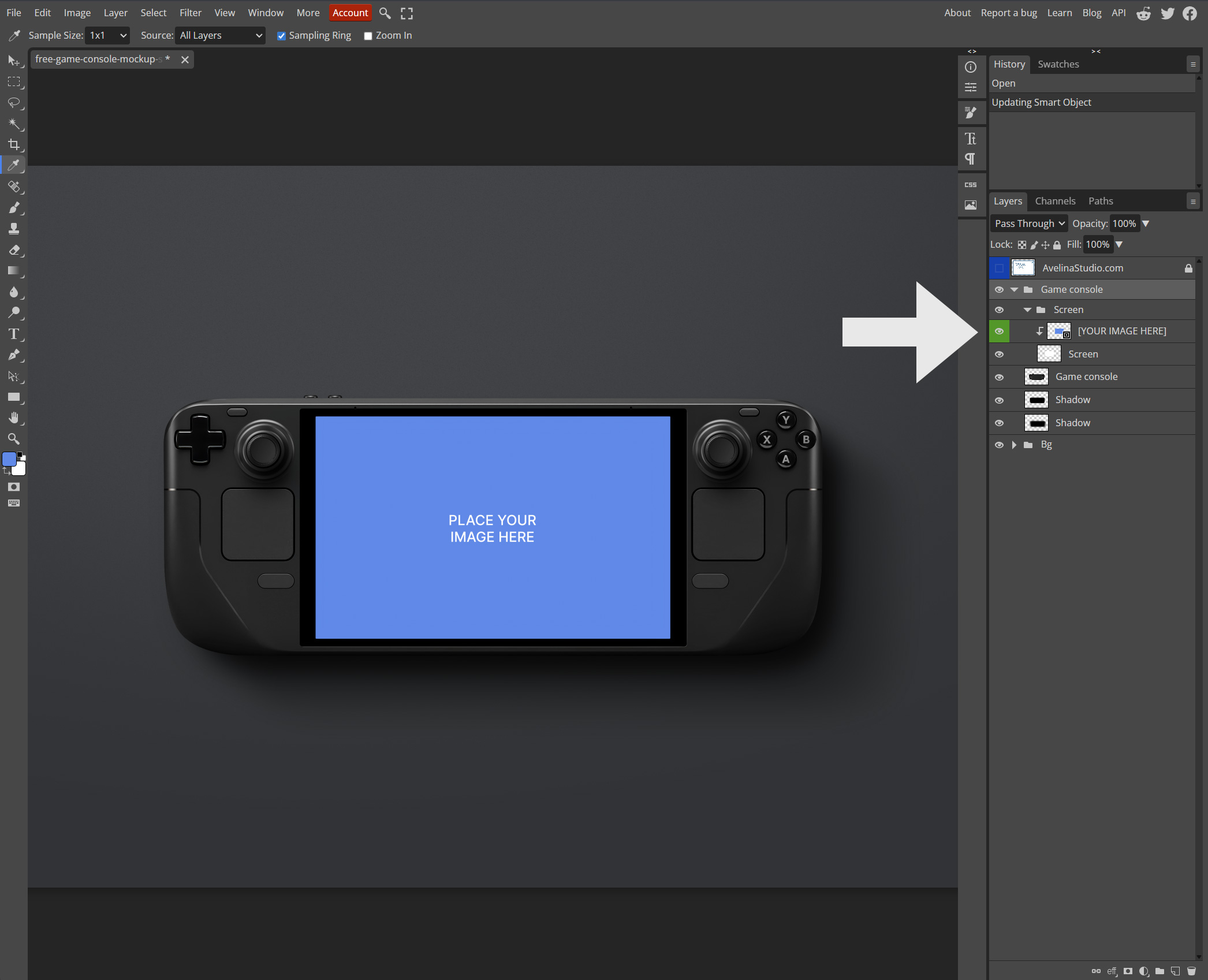 If you don’t have Photoshop, you can use Photopea, a free browser-based editor that supports Smart Objects. The process is almost identical to Photoshop.