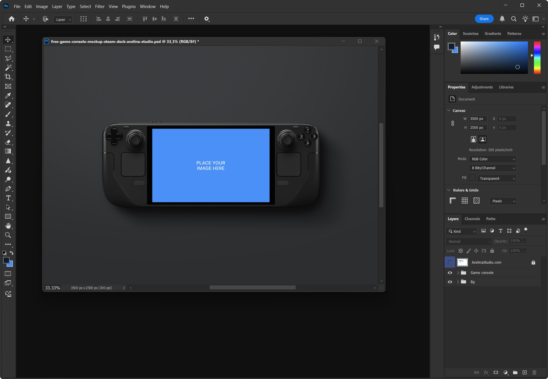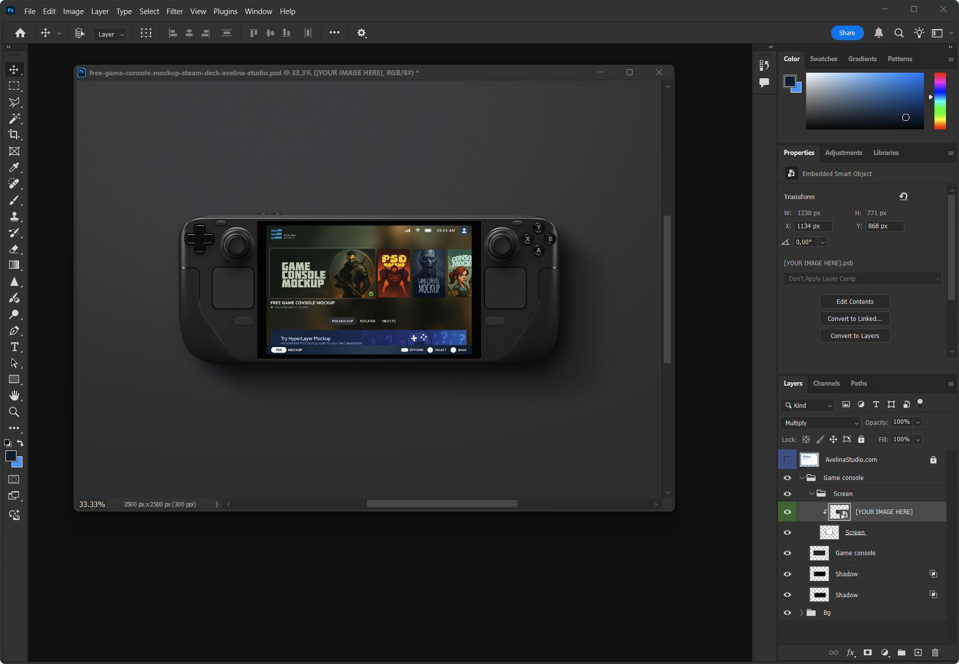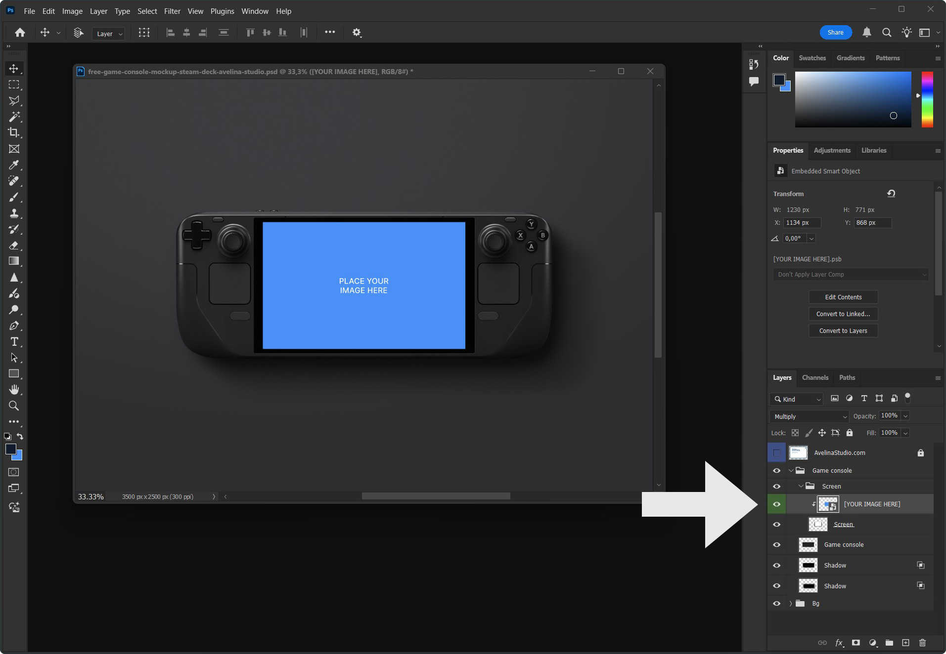 This is the basic workflow. Almost all Avelina Studio mockups also include organized layers to adjust background colors, lights and shadows, so you can refine the scene exactly the way you want.