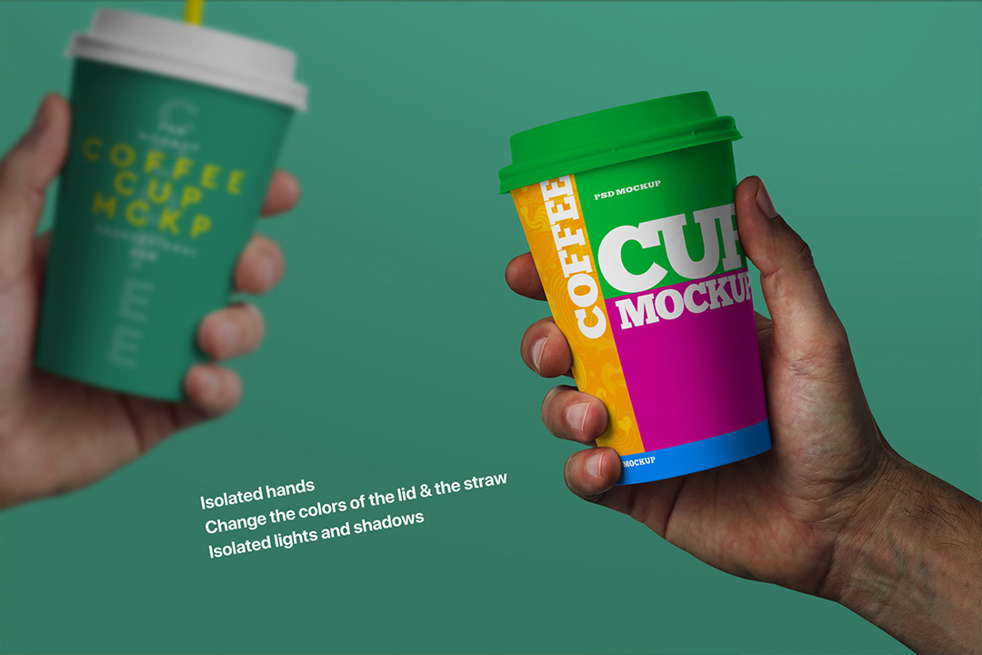 Present beverage branding with this high-resolution Coffee Cup Mockup, captured at 6000 × 4000 px for sharp professional output. Includes 2 isolated takeaway cup objects held naturally in hand for realistic product presentation. Lid and straw colors are fully changeable to match brand identity. Hands are isolated, allowing flexible compositions and background control. Independent light and shadow layers provide precise depth and realism. Ideal for coffee shops, beverage brands, packaging design, and promotional visuals. Perfect for Behance, Dribbble, client presentations, e-commerce listings, and print campaigns.
