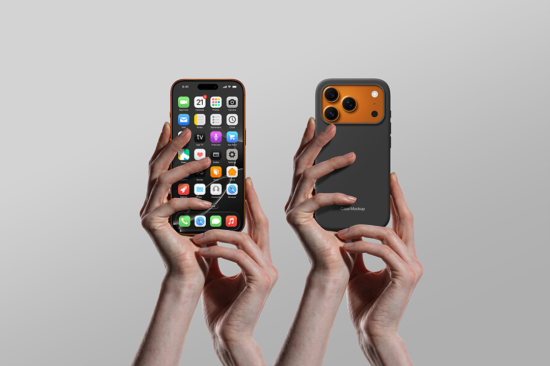 iPhone 17 Mockup – Hands Holding Front View & Back Case