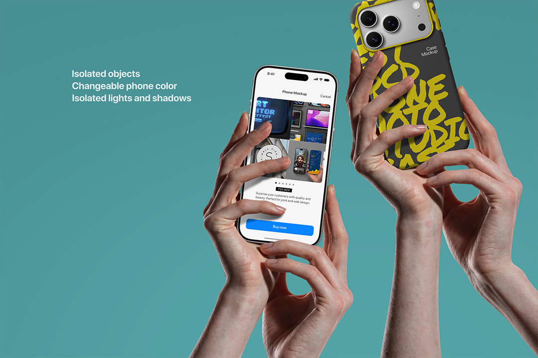 Showcase mobile branding with this high-resolution iPhone 17 Mockup, captured at 7000 × 5000 px for ultra-sharp professional output. Features hands holding the front view of the device alongside the back view with protective case. The phone body color is fully changeable to match brand identity or campaign visuals. Screen content is editable via Smart Objects for fast customization. Isolated objects, lights, and shadows allow full control over depth and composition. Designed for app previews, case branding, UI showcases, and digital marketing visuals. Ideal for Behance, Dribbble, client presentations, e-commerce listings, and print campaigns.