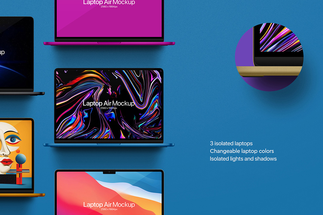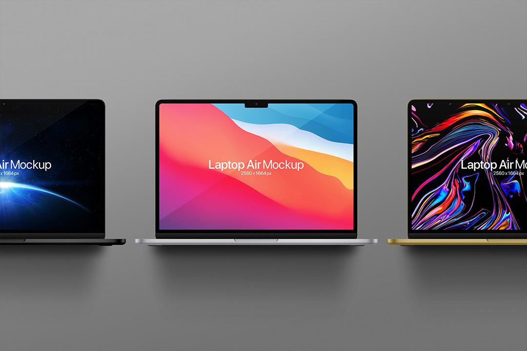Showcase web apps, UI concepts or brand graphics on Apple’s slim notebook. This 6000 × 4000 px PSD delivers three isolated MacBook Air mockups whose aluminium bodies can be recoloured to any tint you need. Each laptop, highlight and shadow sits on its own layer, so you can tweak reflections, hide devices or build custom layouts in seconds. Insert artwork via Smart Objects, save, and export sharp previews for client decks, storefront thumbnails or social posts.