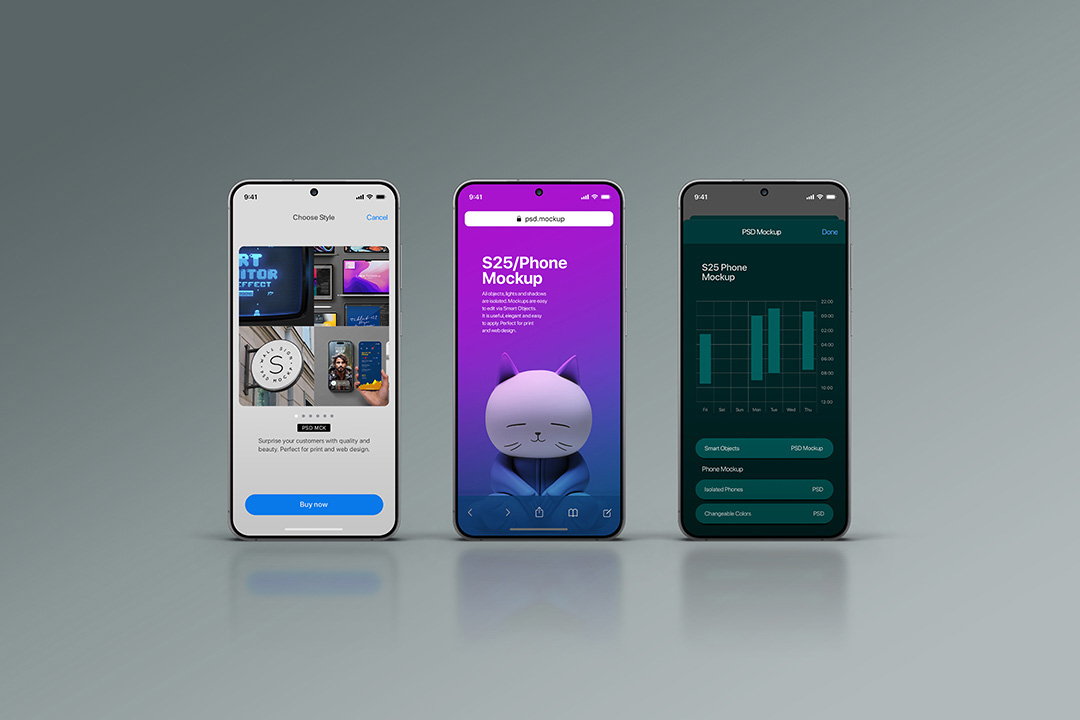 Showcase your mobile designs with this professional Phone Mockup Set – Galaxy S25 (3 Objects) (6500 × 4500 px), designed for stunning UI/UX presentations and digital product showcases. This mockup pack includes three isolated smartphones based on the Samsung Galaxy S25, all presented with editable screens and fully customizable colors. Reflections and lighting respond automatically to your design updates, adding natural realism without extra effort. Independent light and shadow layers give you full control over visual depth, while Photoshop™ Smart Objects make editing fast and intuitive. Perfect for presenting app concepts, websites, dashboards, or promo banners with photorealistic quality. Ready for Behance, Dribbble, portfolio pages, or client decks.