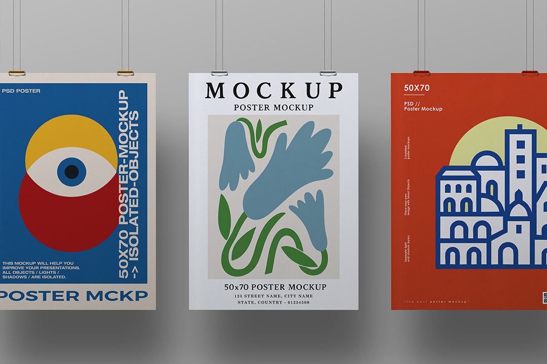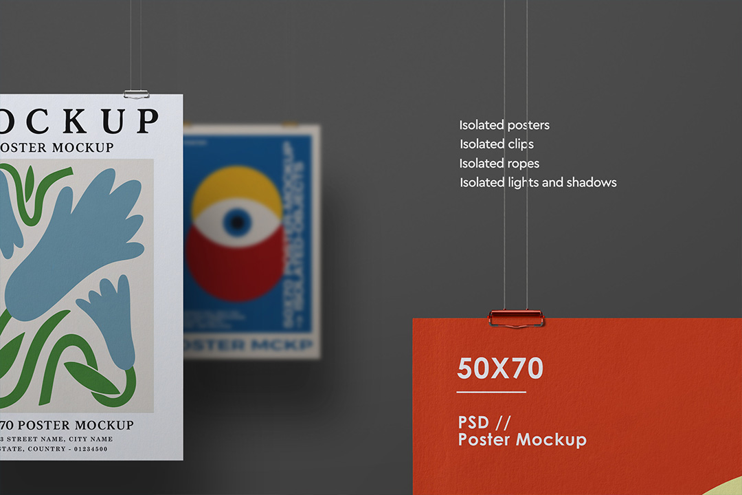 Present poster designs, illustration prints or campaign artwork with this 8500 × 6000 px PSD mockup set. The kit includes three hanging views of 50×70 cm posters suspended by editable binder clips and ropes. Each element—including posters, clips, ropes, shadows and lights—is separated into layers, allowing full customization. Adjust positions, clip colors, or background tones. Insert your design using Smart Objects and export photorealistic visuals for your portfolio or client decks.