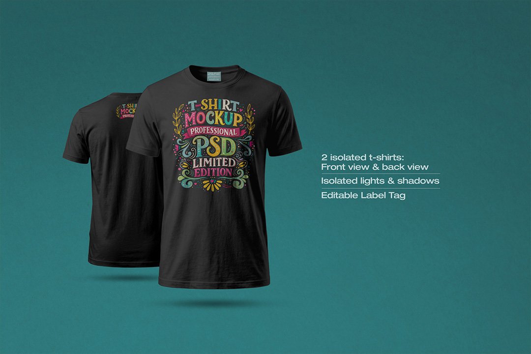 Showcase apparel designs with this high-resolution T-Shirt Mockup, captured at 6000 × 4000 px for professional-quality output. Includes 2 isolated black t-shirts displaying front and back views for complete garment presentation. Fabric folds, seams, and collar details are realistically rendered to ensure accurate print previews on dark fabric. The label tag is fully editable, allowing customization for branding or sizing. Independent light and shadow layers provide precise control over depth and realism. Designed for clothing brands, print-on-demand workflows, and apparel marketing. Ideal for Behance, Dribbble, client presentations, e-commerce listings, and print campaigns.