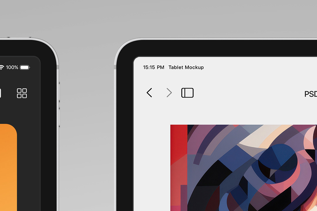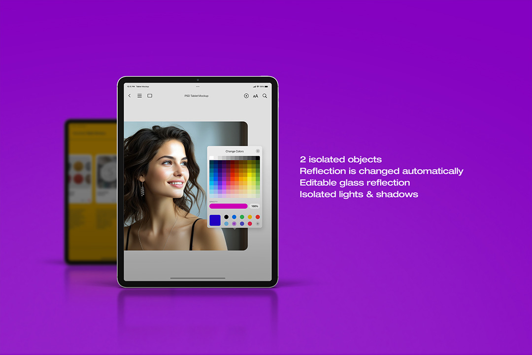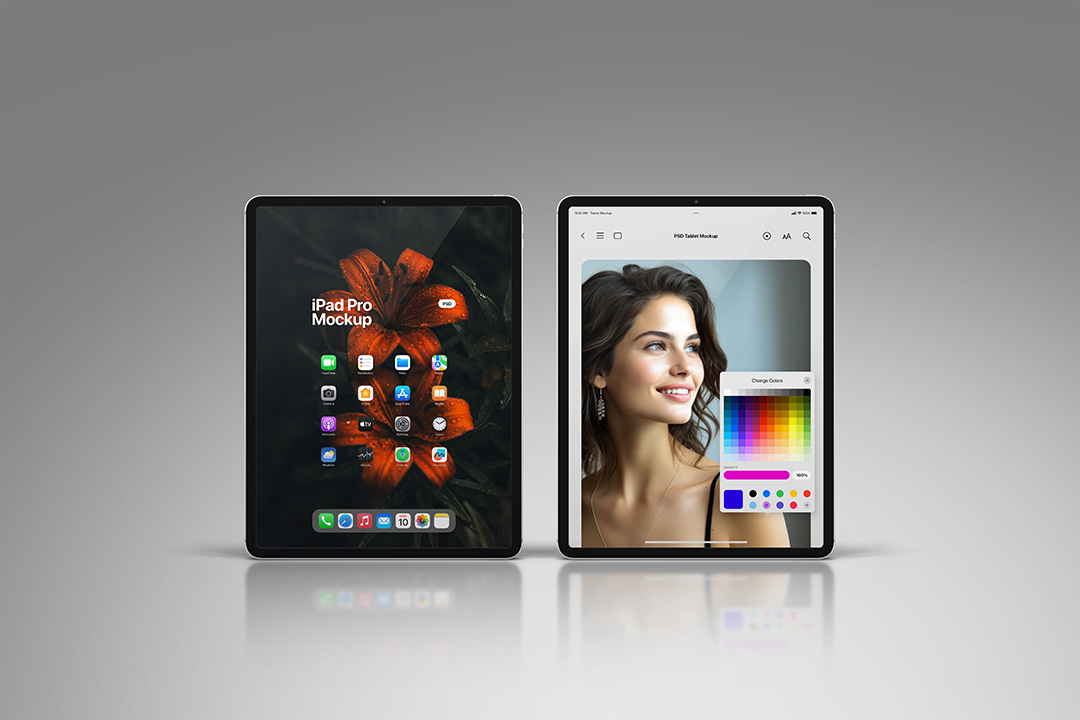 Showcase app interfaces and branding with this set of 2 high-resolution tablet mockups based on iPad Pro (6000 × 4000 px). Both scenes feature vertical devices on reflective surfaces with thin silver borders for realistic hardware proportions. Replace screens instantly via Photoshop Smart Objects for fast workflows and pixel-sharp previews. Automatic reflection adjustment and editable glass reflections enhance realism without manual masking. Independent light and shadow layers provide flexible art direction and effortless matching to your project. Perfect for UI/UX case studies, digital portfolios, e-commerce listings, client presentations and print campaigns.